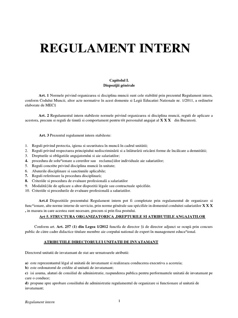 Art. 1 Normele privind organizarea si disciplina muncii sunt cele stabilité prin prezentul Regulament intern,