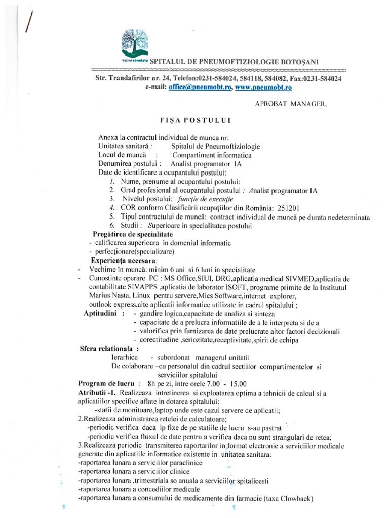 0%(1)0% au considerat acest document util (1 vot) 527 vizualizări4 paginiFisa Postului Analist Programator PDF
