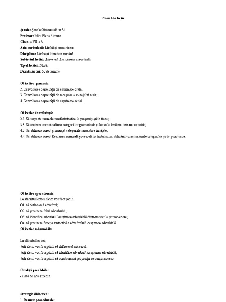 Proiect de lecție