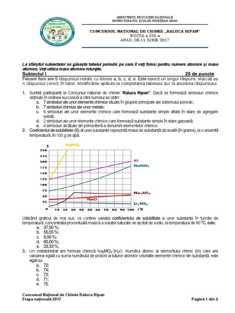 La sfârșitul subiectelor se găsește tabelul periodic pe care îl veți folosi pentru numere atomice și mase