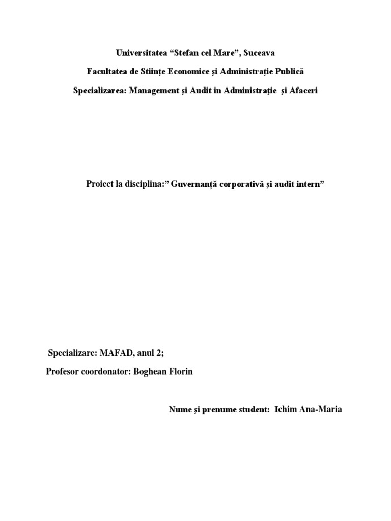 Proiect la disciplina:” Guvernanță corporativă şi audit intern”