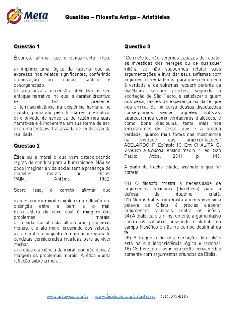 Questões – Filosofia Antiga – Aristóteles
