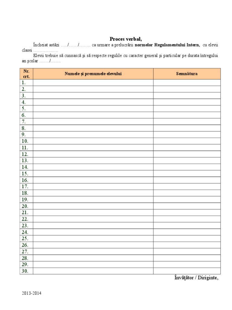 Încheiat astăzi …../……/…….. ca urmare a prelucrării normelor Regulamentului Intern, cu elevii