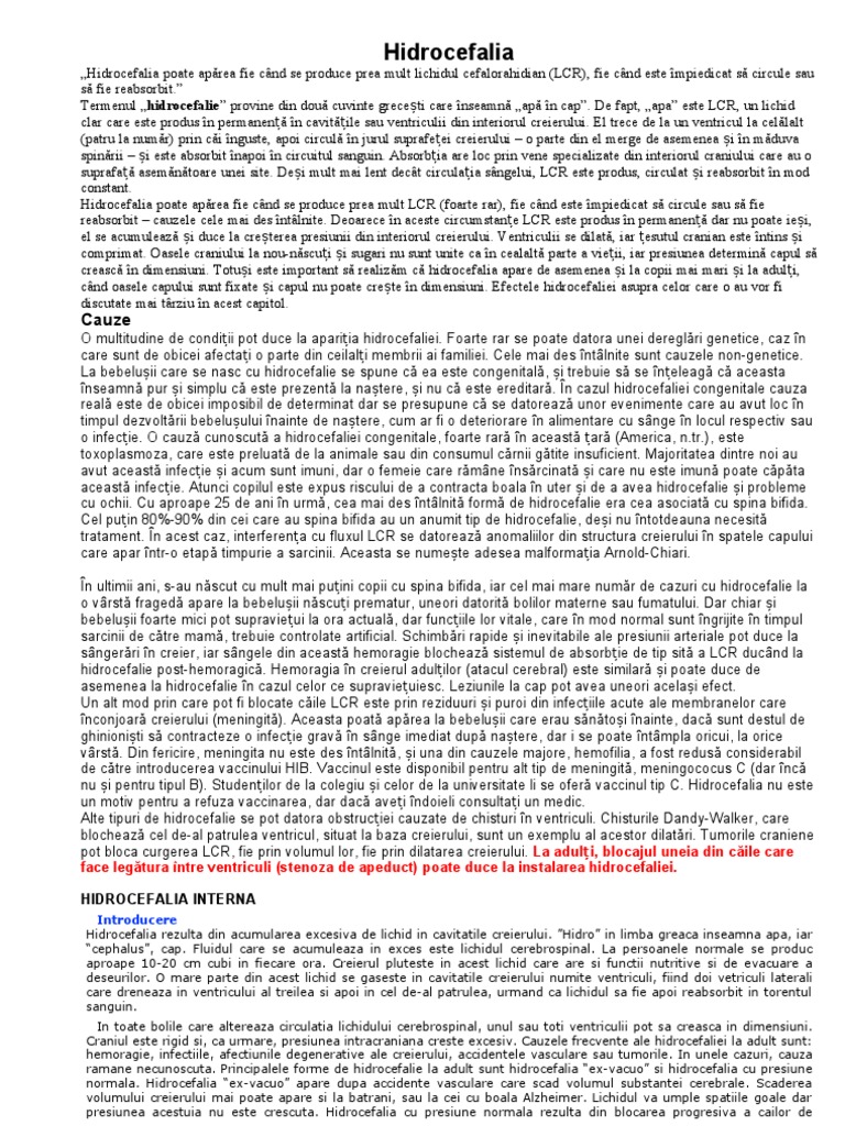circulatie si resorbtie ale lichidului cerebrospinal. Ventriculii se dilata ca urmare a cresterii cantitatii de lichid, iar