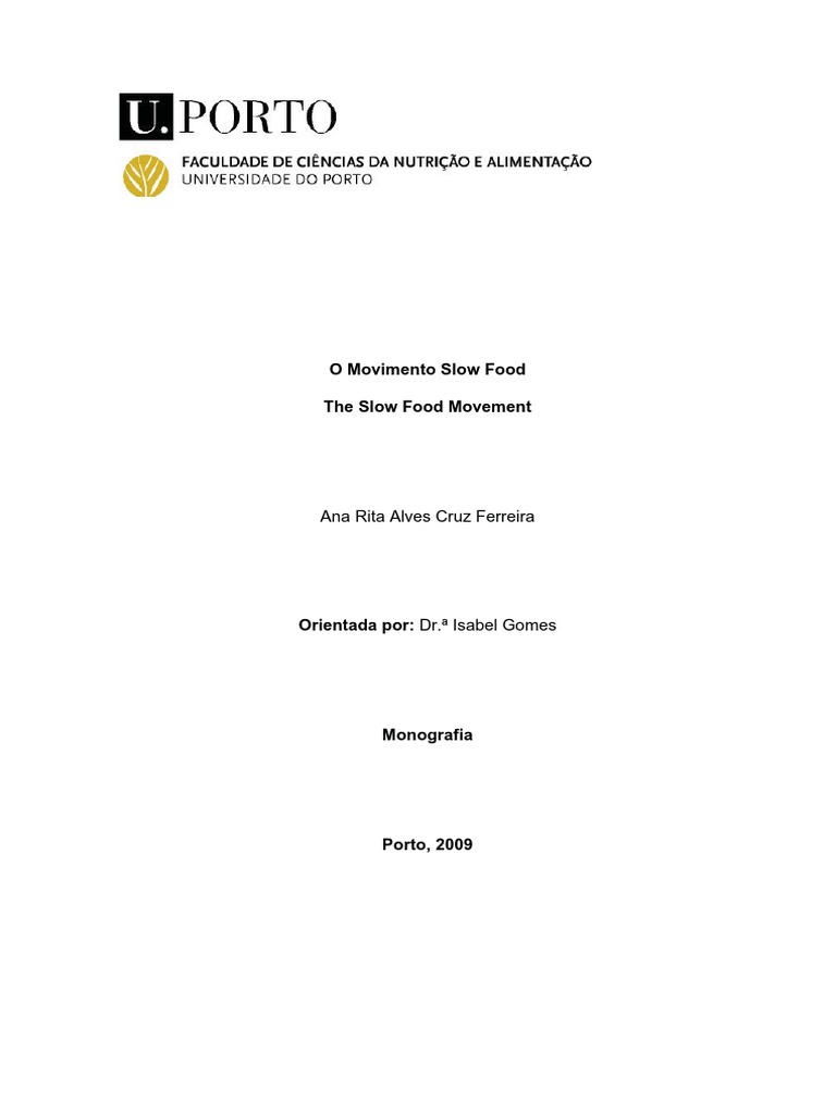 emergente movimento social que surge como resposta aos efeitos negativos da globalização. A SF defende a recuperação do gosto e da qualidade dos alimentos, recuperando alguns princípios da Alimentação Mediterrânica, sustenta os seguintes valores: comer as refeições tranquilamente numa mesa cuidadosamente preparada, respeitar a sazonalidade dos produtos, consumir alimentos pouco processados e de produção local, bem como atribui importância à convivencialidade às refeições. Este movimento defende estes princípios, como forma de antagonizar o estilo de vida característico das sociedades modernas de consumo, onde a cultura FF domina. Este movimento internacional pretende ligar a ética e o prazer da alimentação, daí ter surgido o conceito: eco-gastronomia. Assim, a promoção da sua filosofia pode impedir a propagação de modelos alimentares nocivos, como o da FF. A SF, surge como uma alternativa sustentável e bastante verosímil, de contra ataque à cultura FF. Sendo que muitos dos seus fundamentos seriam uma mais valia para a população. Com novos estilos/padrões alimentares emergentes é importante que o Nutricionista esteja altura de novos desafios. O papel que este profissional de saúde pode desempenhar, no âmbito deste movimento, passa por desenvolver uma cooperação multidisciplinar com os membros deste movimento, para ambos atingirem o mesmo fim: educação alimentar dos futuros consumidores. O Nutricionista ao entrar em parceria com esta organização contribuirá para aumentar o carácter científico deste movimento.