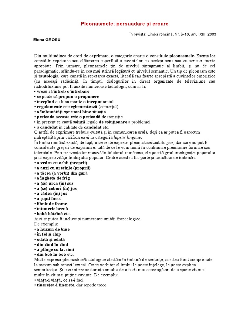 si pentru ca nu se cunoaste suficient sensul cuvantului. Cateva exemple de pleonasme: “Sa