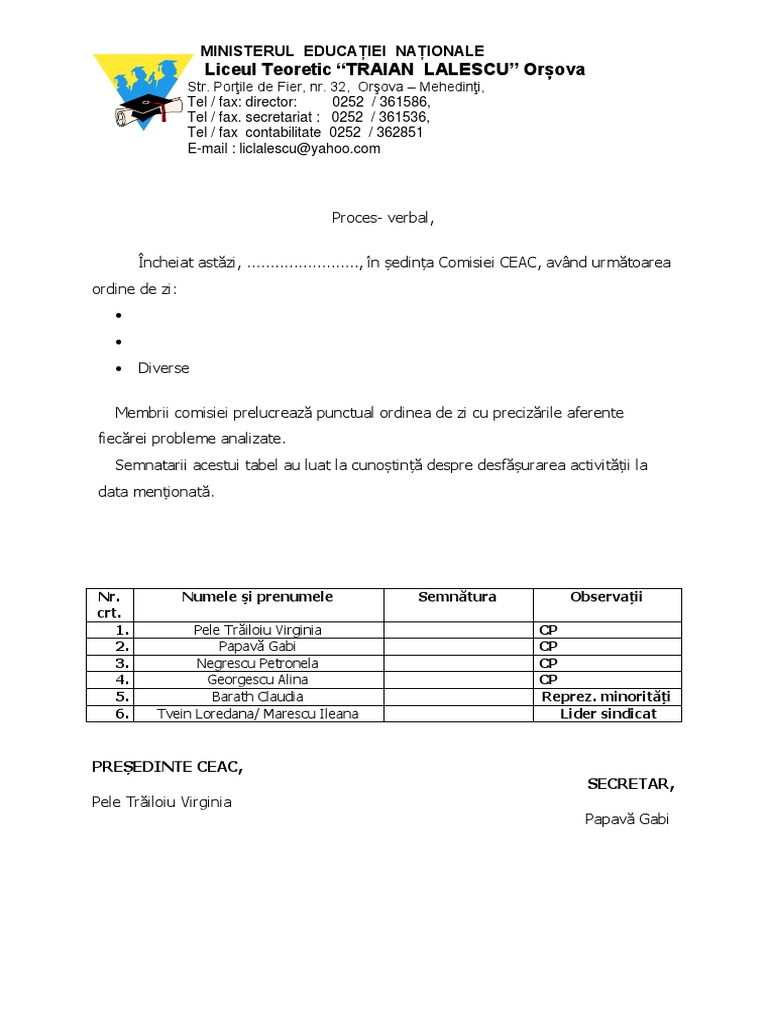 Încheiat astăzi, ........................, în ședința Comisiei CEAC, având următoarea