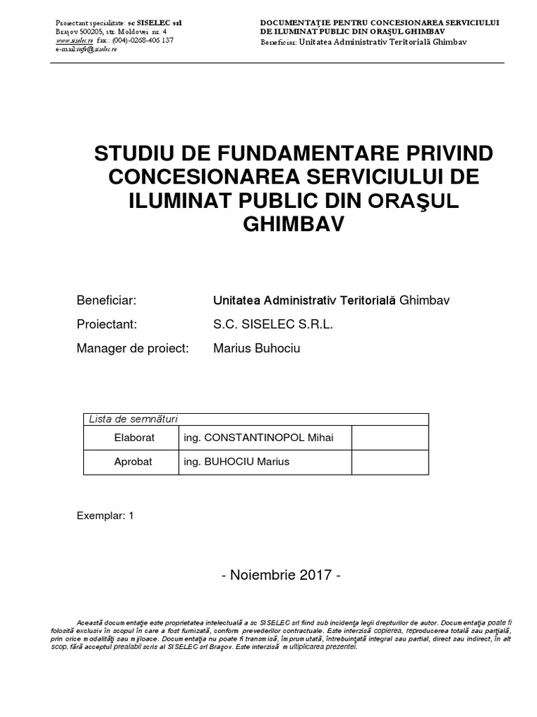 Proiectant specialitate: sc SISELEC srl DOCUMENTAȚ IE PENTRU CONCESIONAREA SERVICIULUI