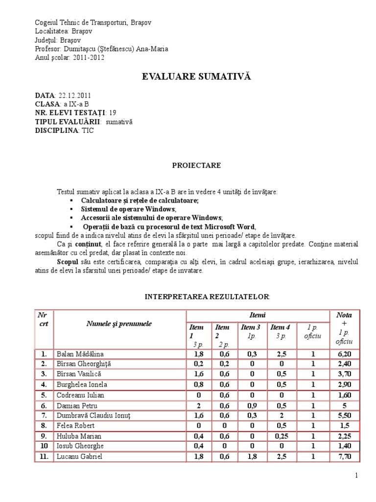Din analiza testelor s-a observat că aproximativ jumătate din efectivul de elevi a reuşit: