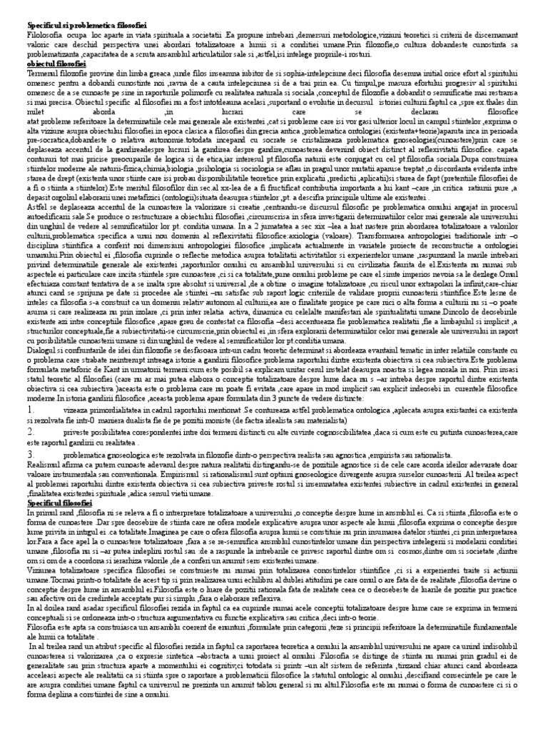 [Link] obiectul ei ,filosofia cuprinde o reflectie metodica asupra totalitatii activitatilor si experientelor umane ,raspunzand la marile intrebari