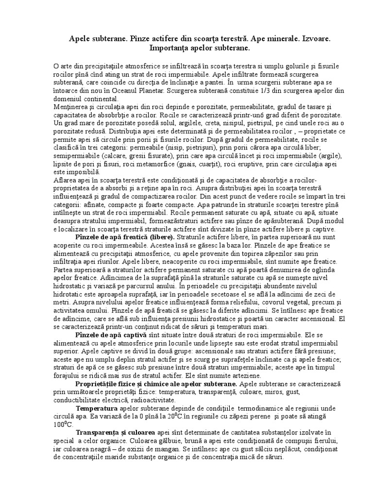 Apele subterane. Pînze actifere din scoarţa terestră. Ape minerale. Izvoare.