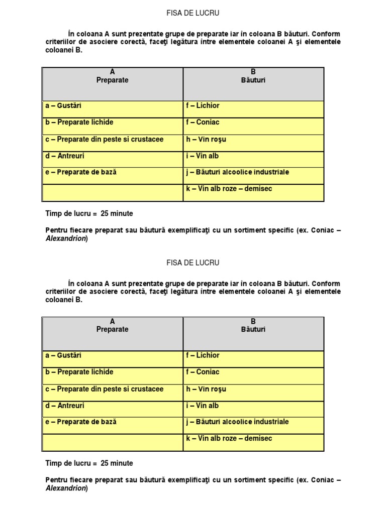 În coloana A sunt prezentate grupe de preparate iar în coloana B băuturi. Conform