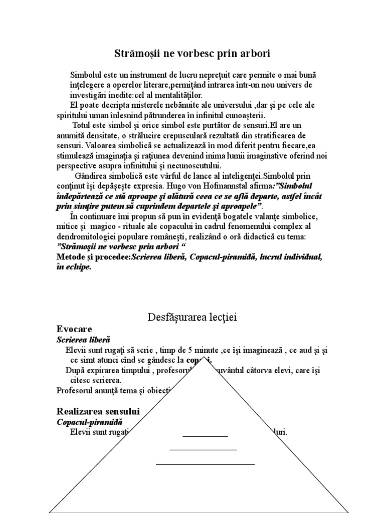 dendromitologiei populare româneşti, realizând o oră didactică cu tema: