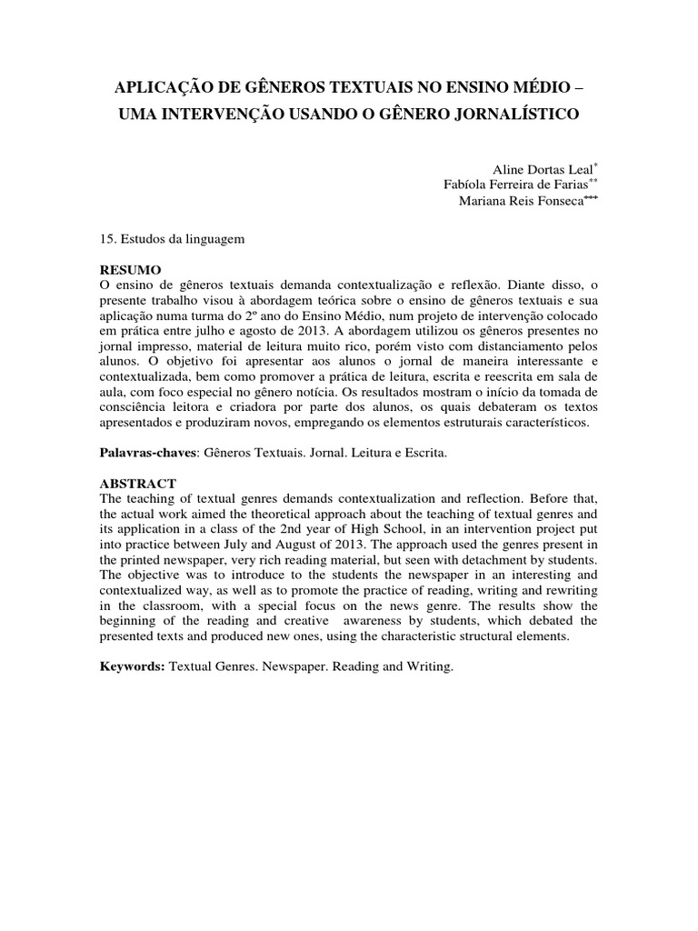em prática entre julho e agosto de 2013. A abordagem utilizou os gêneros presentes no