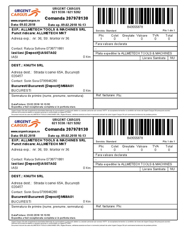 Document intocmit de catre ALLMETECH TOOLS & MACHINES SRL, Riglea Roxana, validarea acestuia se face in momentul preluarii de catre Urgent Cargus SA prin semnarea borderoului de predare-primire.