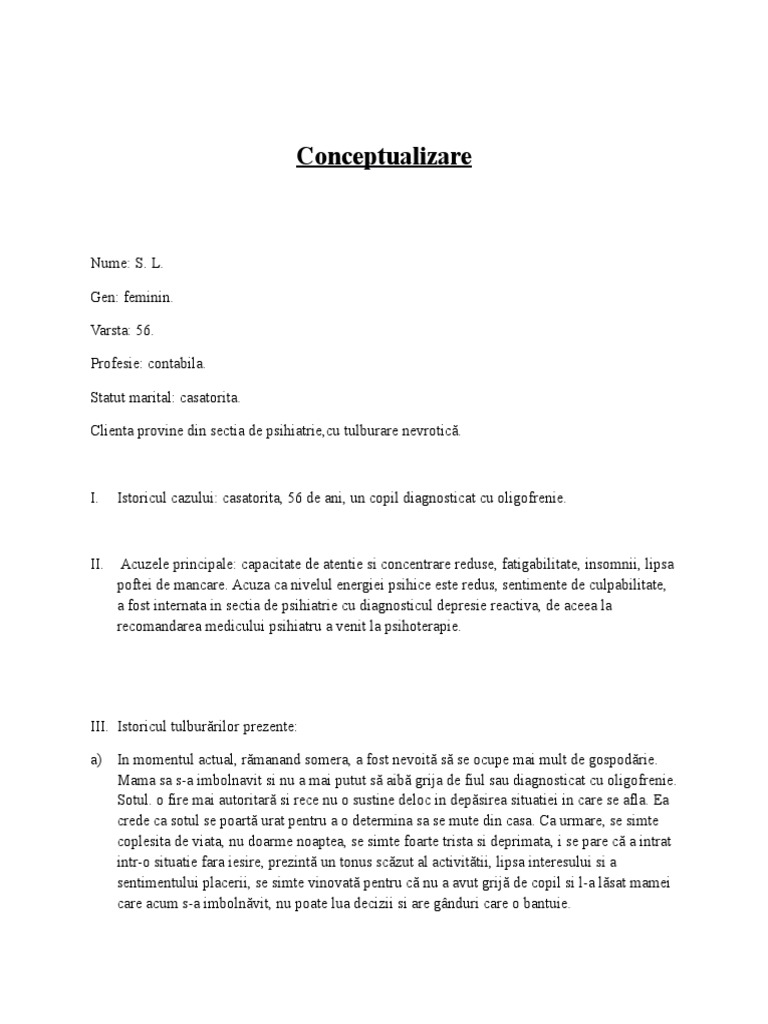 I. Istoricul cazului: casatorita, 56 de ani, un copil diagnosticat cu oligofrenie.