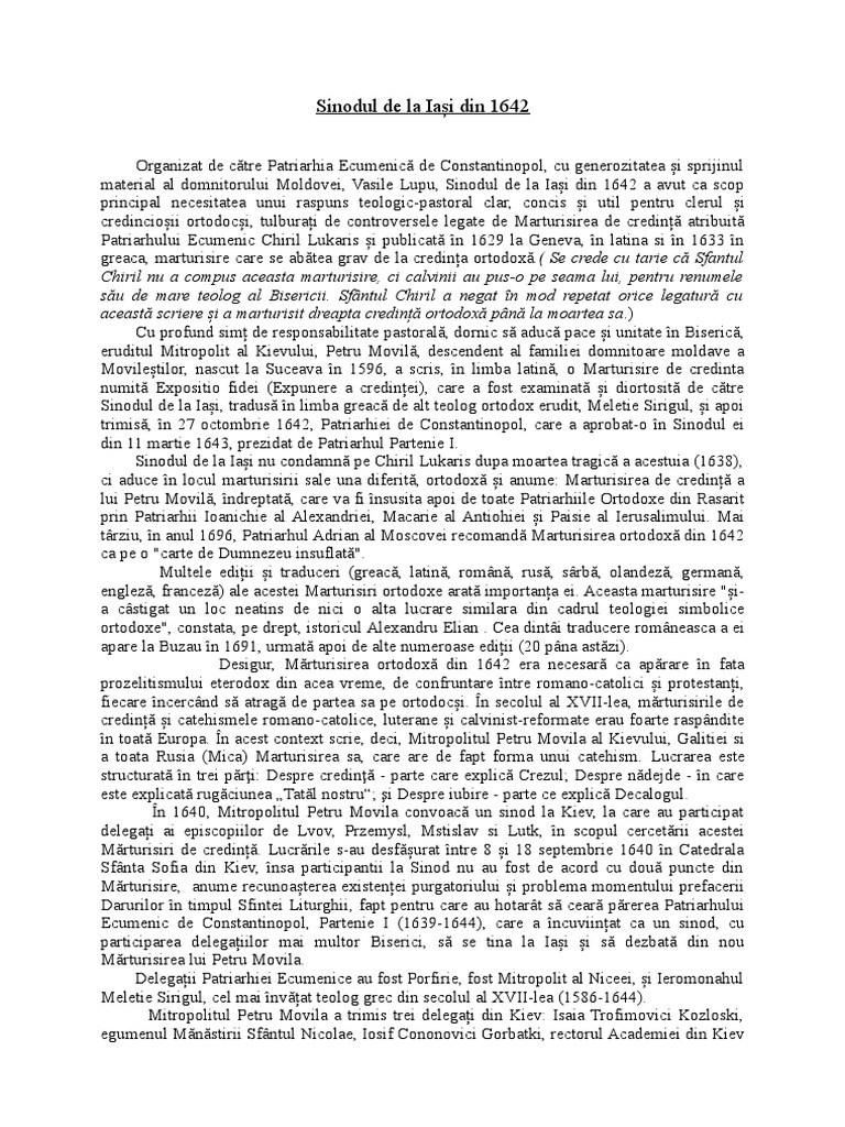 consideră că "alaturi de Sinodul de la Ierusalim (1672), Sinodul de la Iasi (1642) este cel mai