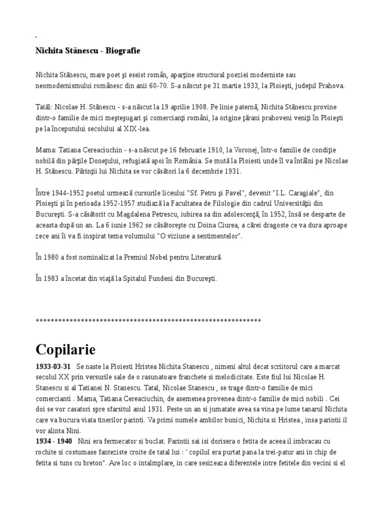 1933-03-31 Se naste la Ploiesti Hristea Nichita Stanescu , nimeni altul decat scriitorul care a marcat
