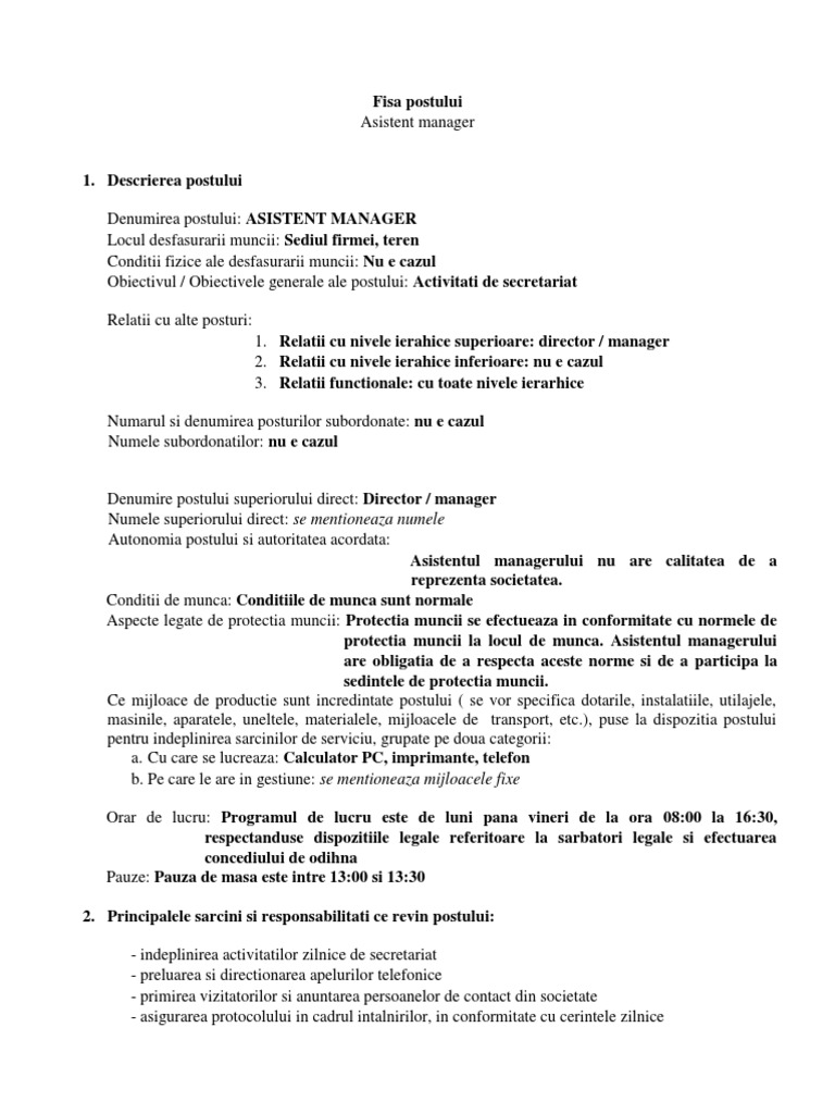 2. Principalele sarcini si responsabilitati ce revin postului:
