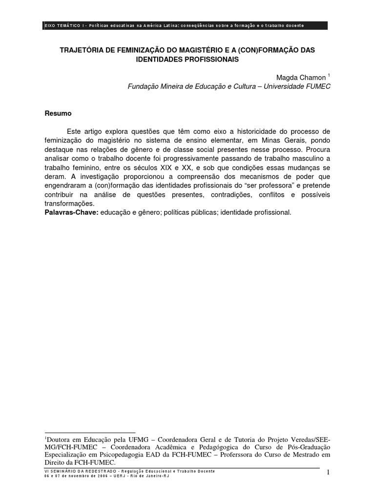 Palavras-Chave: educação e gênero; políticas públicas; identidade profissional.