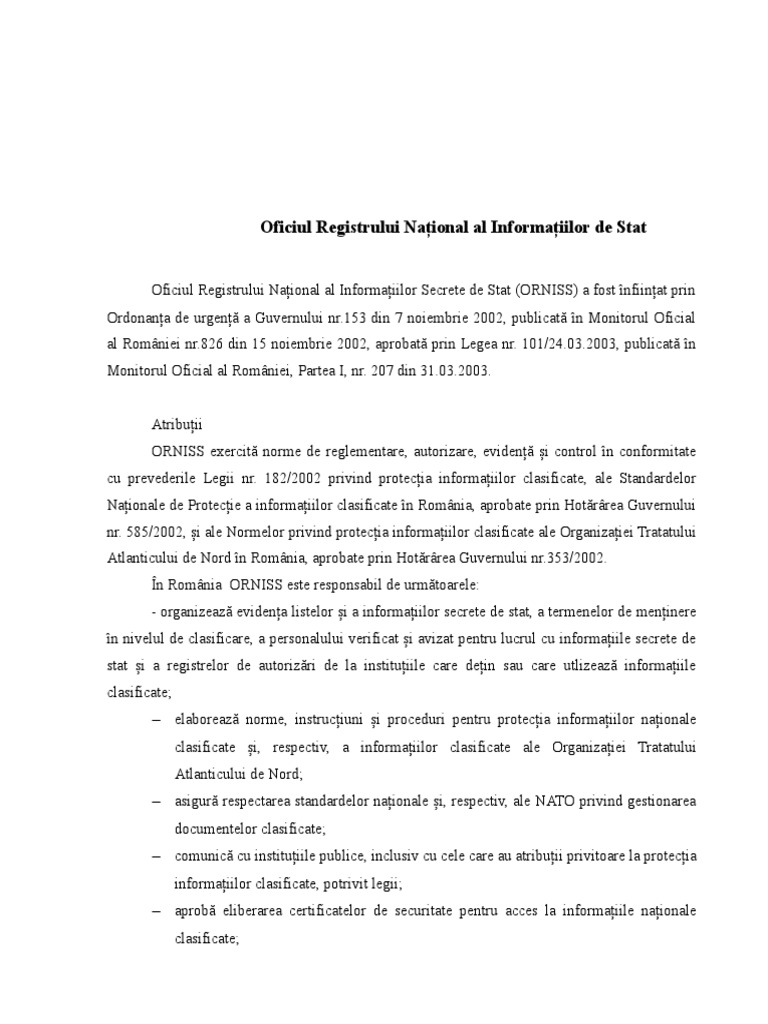 Oficiul Registrului Național al Informațiilor Secrete de Stat (ORNISS) a fost înființat prin