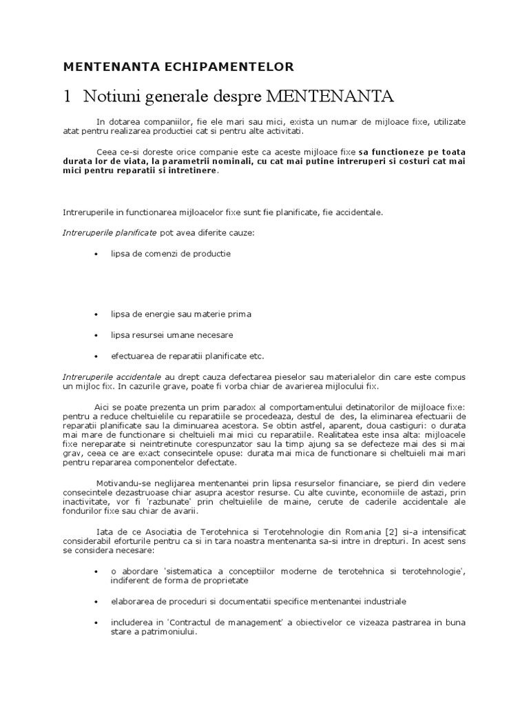 Mentenanta, definita ca un ansamblu de activitati care au ca scop mentinerea in stare de