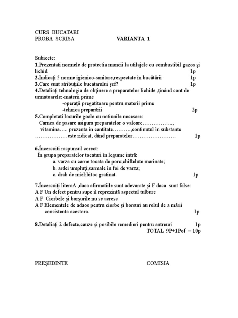 [Link]ţi principalele atribuţii ale bucătarului şef. 1p