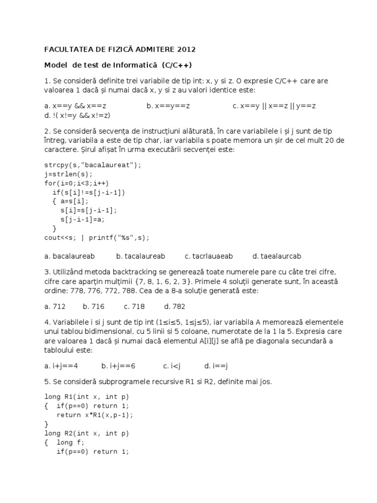 FACULTATEA DE FIZICĂ ADMITERE 2012