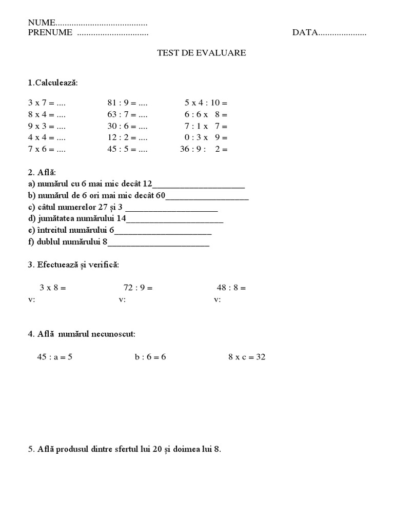 5. Află produsul dintre sfertul lui 20 și doimea lui 8.