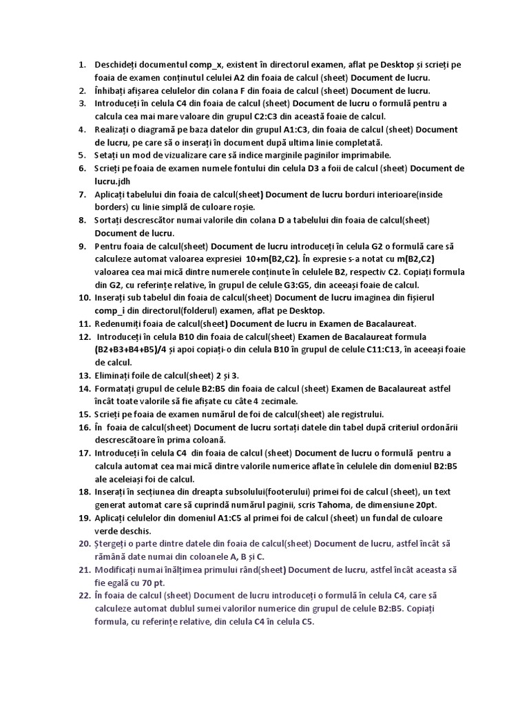 foaia de examen conținutul celulei A2 din foaia de calcul (sheet) Document de lucru.