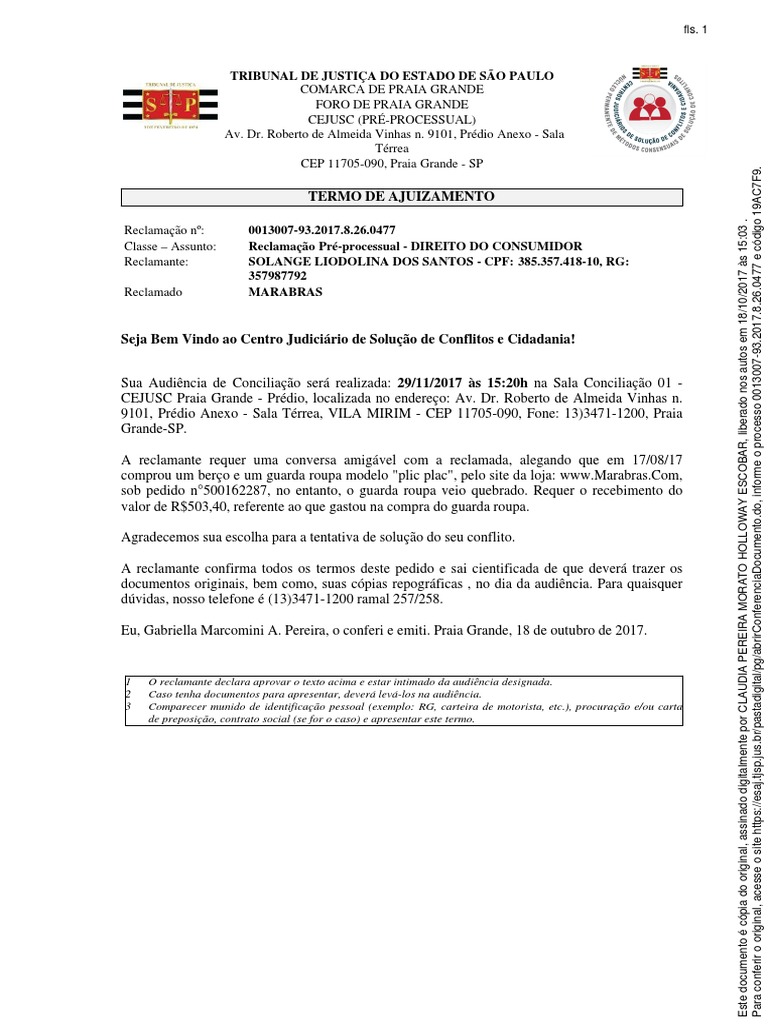 Contrato Social, Carta de Preposição, Procuração etc.) Contrato de Prestação de Serviços, carnês, comprovantes de pagamentos, certidão de casamento, certidão de nascimento dos filhos, documentação de bens móveis e imóveis, bem como outros documentos que, no seu entendimento, possam ser úteis para a composição do acordo. 3) Esta reclamação tramita eletronicamente. A visualização do conteúdo da reclamação pré-processual é realizada mediante acesso ao sítio do TJSP, na internet, no endereço abaixo indicado. Praia Grande, 19 de outubro de 2017. Yasmin Souza de Jesus, Estagiária Nível Médio.