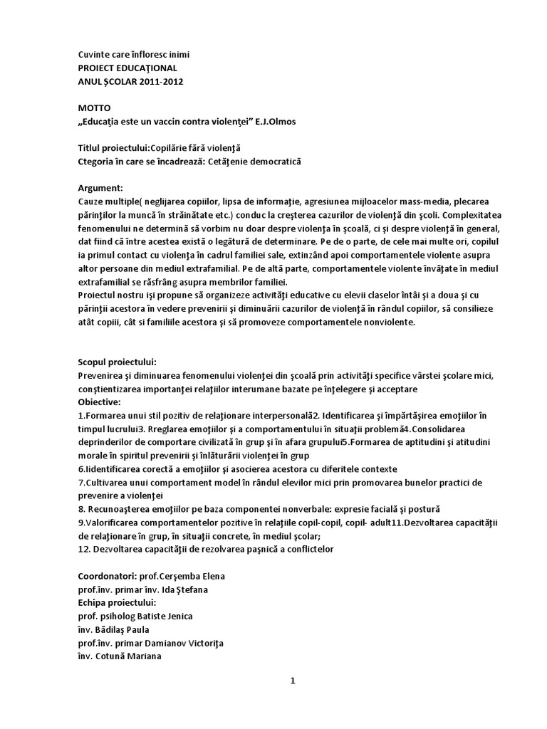 Titlul proiectului:Copilărie fără violenţă