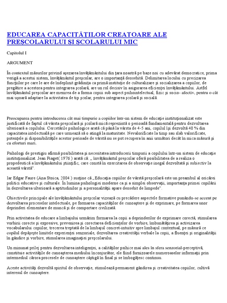 care pe lângă dezvoltarea fizică armonioasă, contribuie la stimularea proceselor de creaţie, previne instalarea unor