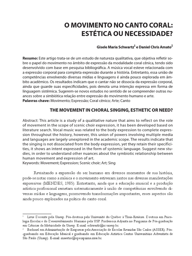 Revisitando a expressão do ser humano em diversos momentos de sua história, pode-se notar como a música e o movimento estiveram juntos nas diversas manifestações expressivas (MENDES, 1985). Entretanto, ainda que a educação musical e a produção artística profissional remetam sistematicamente à união de competências envolvendo di- versas mídias e linguagens, promovendo transformações importantes, esses aspectos são ainda pouco explorados na prática do canto coral.