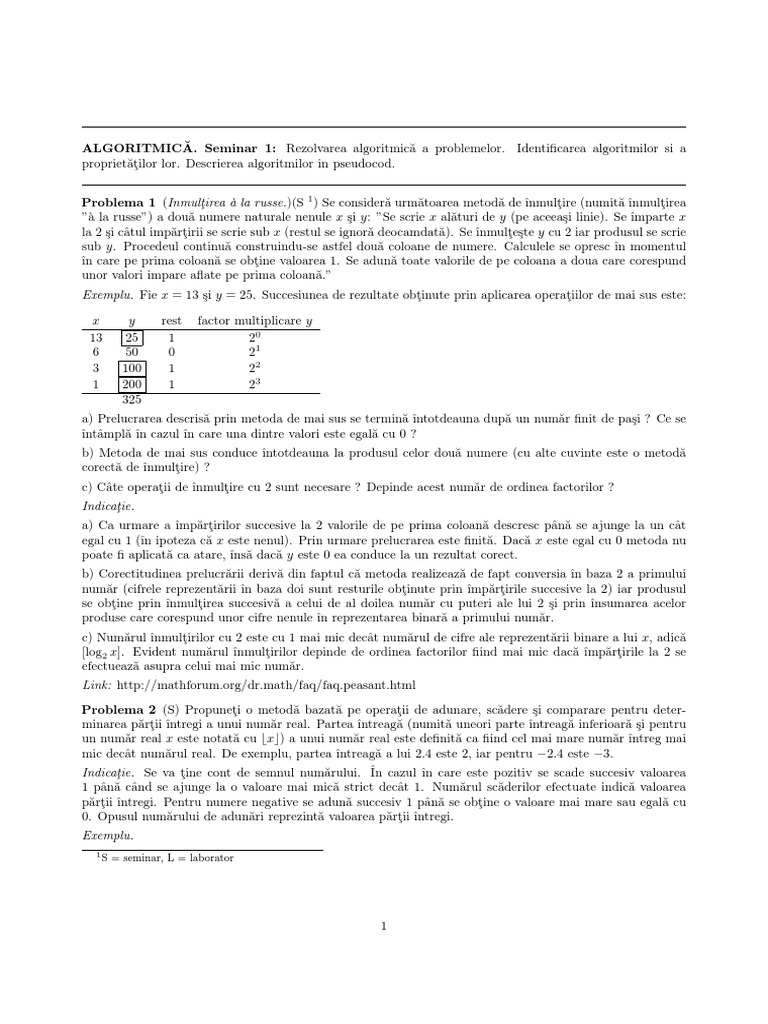 Problema 1 (Inmulţirea à la russe.)(S 1 ) Se consideră următoarea metodă de ı̂nmulţire (numită ı̂nmulţirea