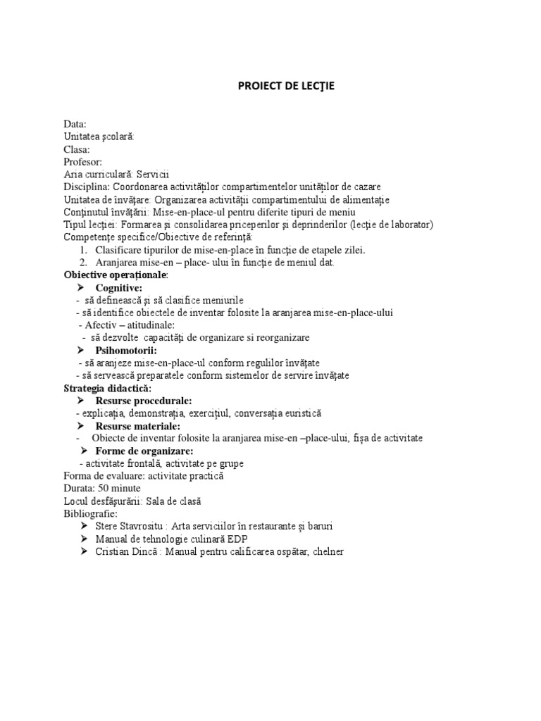 - să aranjeze mise-en-place-ul conform regulilor învăţate