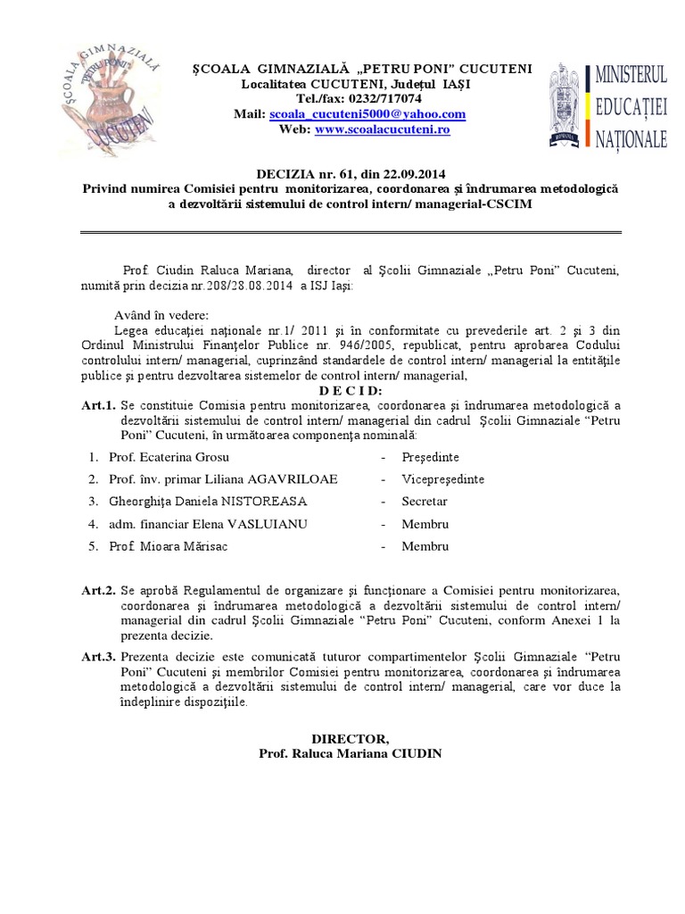 Şcolii Gimnaziale “Petru Poni” Cucuteni, pe baza propunerilor membrilor CSCIM şi ale