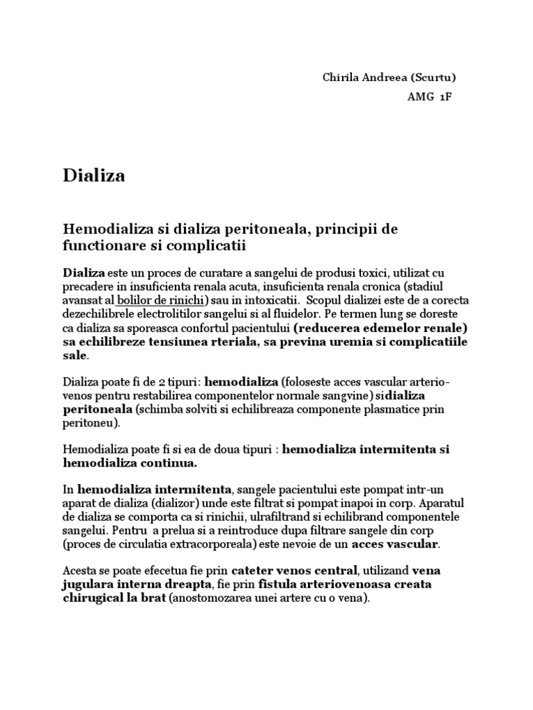 Dializa poate fi de 2 tipuri: hemodializa (foloseste acces vascular arterio-