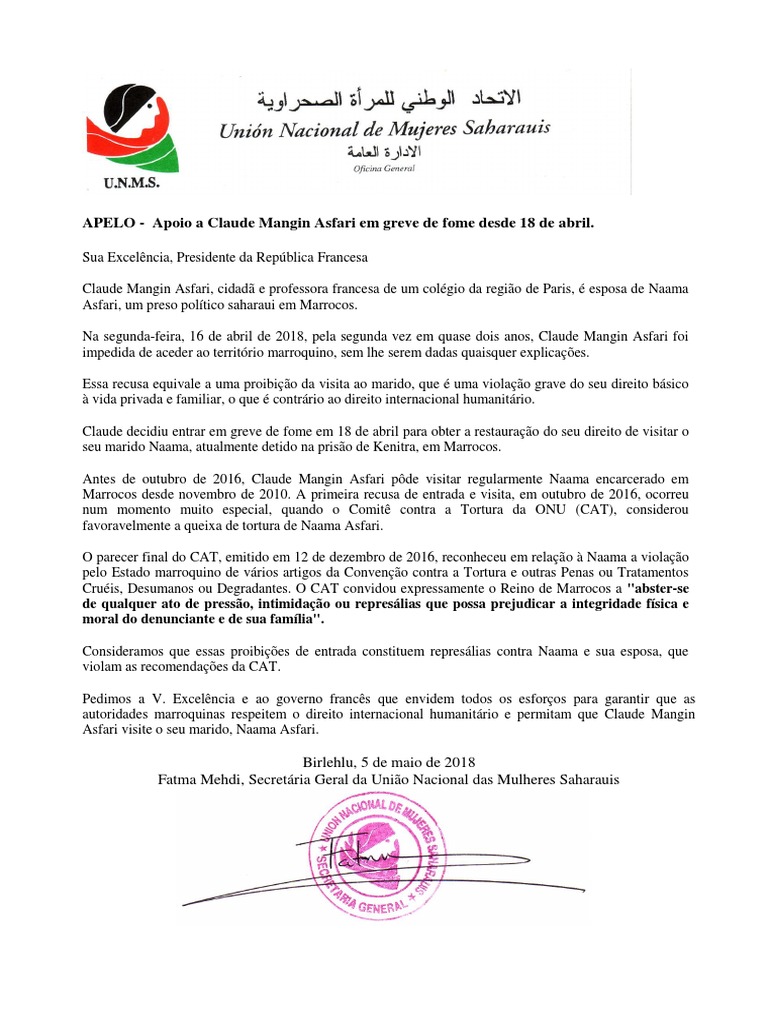 autoridades marroquinas respeitem o direito internacional humanitário e permitam que Claude Mangin
