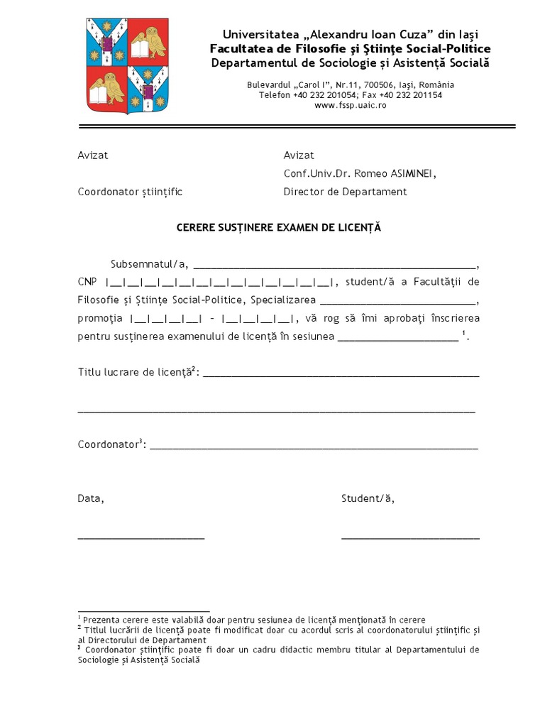 pentru susținerea examenului de licență în sesiunea _____________________ 1.