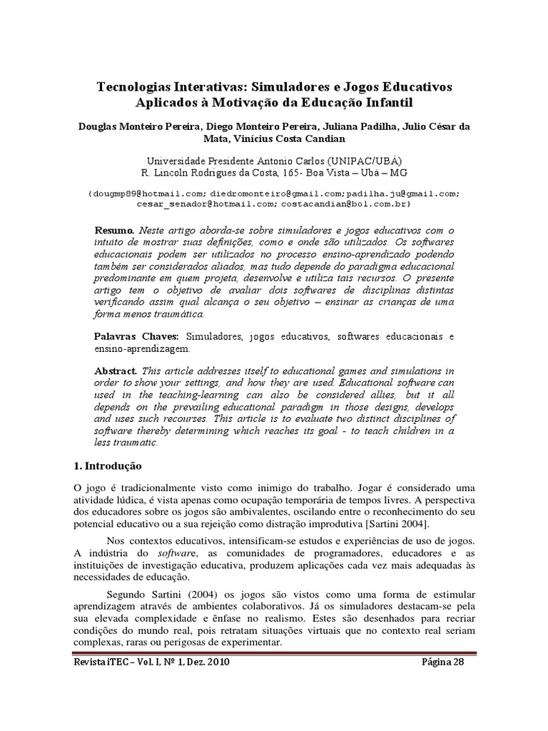 Palavras Chaves: Simuladores, jogos educativos, softwares educacionais e ensino-aprendizagem.