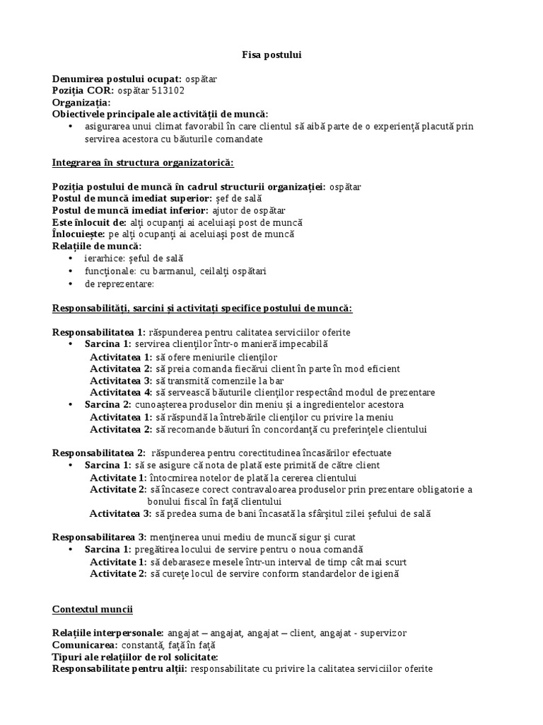 Poziția postului de muncă în cadrul structurii organizației: ospătar