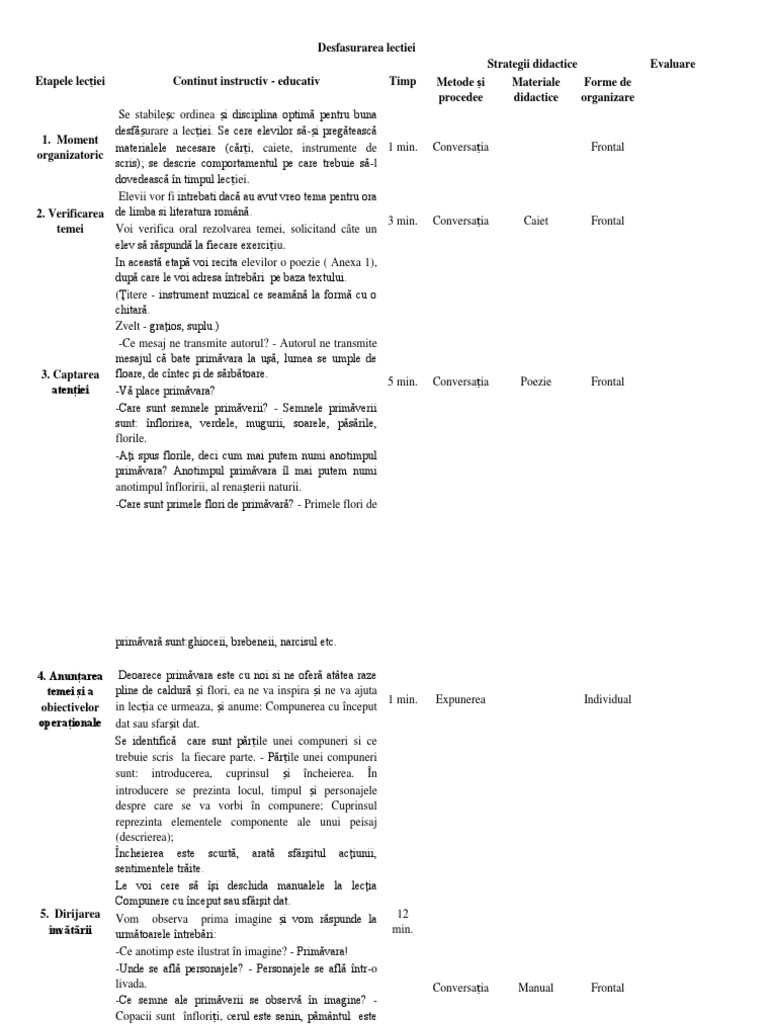 desfășurare a lecției. Se cere elevilor să-și pregătească