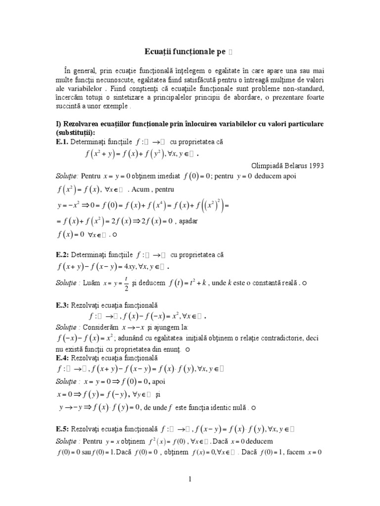 I) Rezolvarea ecuaţiilor funcţionale prin înlocuirea variabilelor cu valori particulare
