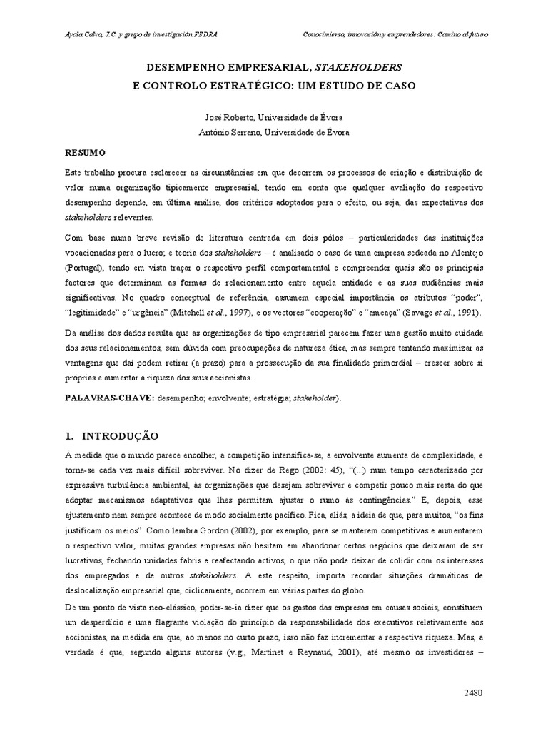 DESEMPENHO EMPRESARIAL, STAKEHOLDERS E CONTROLO ESTRATÉGICO: UM ESTUDO DE CASO