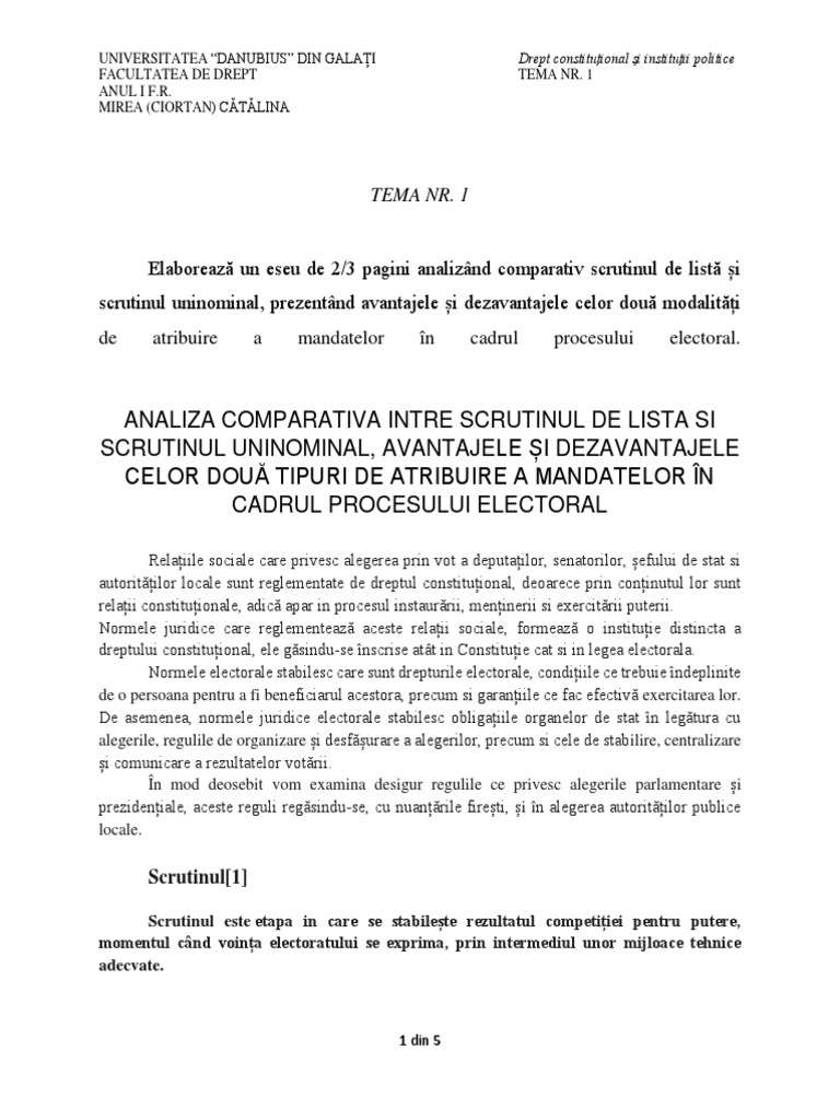 Elaborează un eseu de 2/3 pagini analizând comparativ scrutinul de listă și