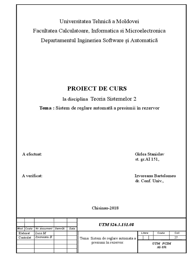 Tema : Sistem de reglare automată a presiunii în rezervor
