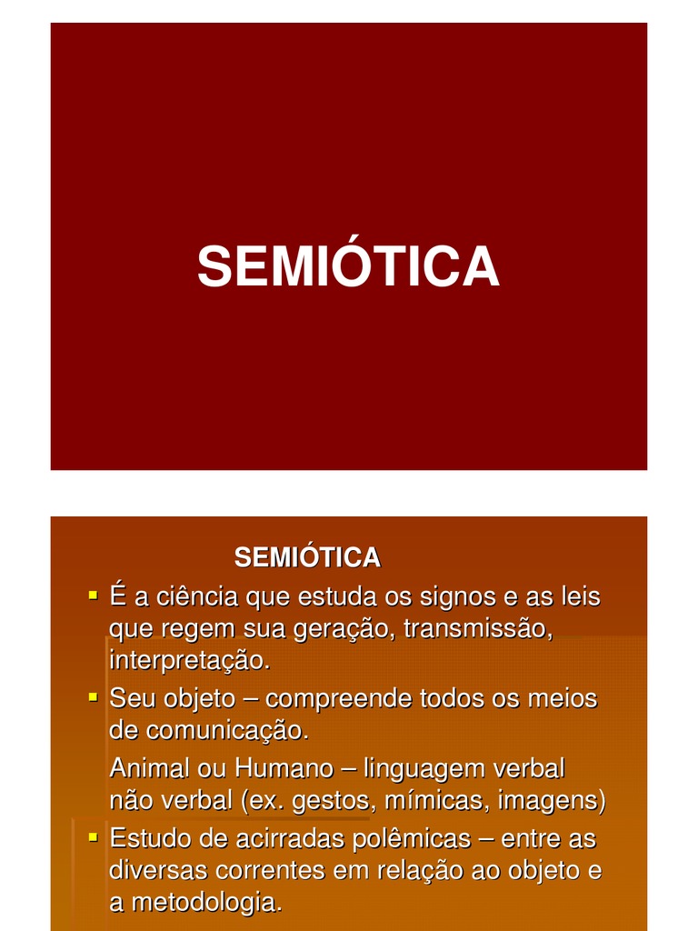 Semiologia - Possui origem européia, é mais entendido como o estudo de linguagens particulares (imagens, gestos, teatro etc).