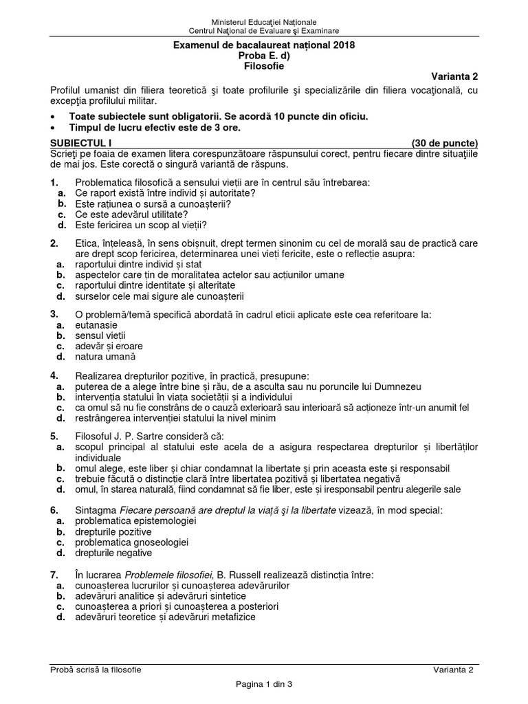 Probă scrisă la filosofie Varianta 2