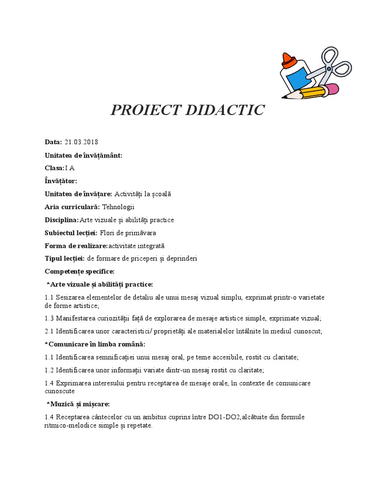 organizatoric lecţiei. Se pregătesc materialele necesare pentru